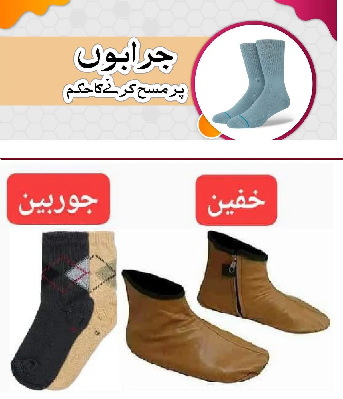 الجوربین (الْجَوْرَبَيْنِ) سے مراد وہ موزے ہیں جو اون یا سوتی کپڑے کے بنے ہوں اور اردو میں انہیں جراب کہا جاتا ہے، جبکہ الخُفَّیْن وہ موزے ہیں جو چمڑے کے بنے ہوتے ہیں۔ ان دونوں میں صرف مادے کا فرق ہے، باقی حکم کے اعتبار سے کوئی بنیادی فرق نہیں۔ خفین پر مسح تو صحیح سند سے صحیح بخاری میں ثابت ہے، البتہ الجوربین یعنی کپڑے کی جرابوں پر مسح کے مسئلے پر دلائل اس مضمون میں تفصیل سے پیش کیے جائیں گے: سب سے پہلے مرفوع احادیث، پھر صحابہ کرامؓ کا تعامل اور اجماعی طرزِ عمل، اس کے بعد تابعین کے آثار، پھر اہلِ حدیث اور احناف کے فتاویٰ بالخصوص امام ابو حنیفہؒ کا رجوع، اور آخر میں سید نذیر حسینؒ سے منسوب شاذ قول کا مدلّل جواب۔