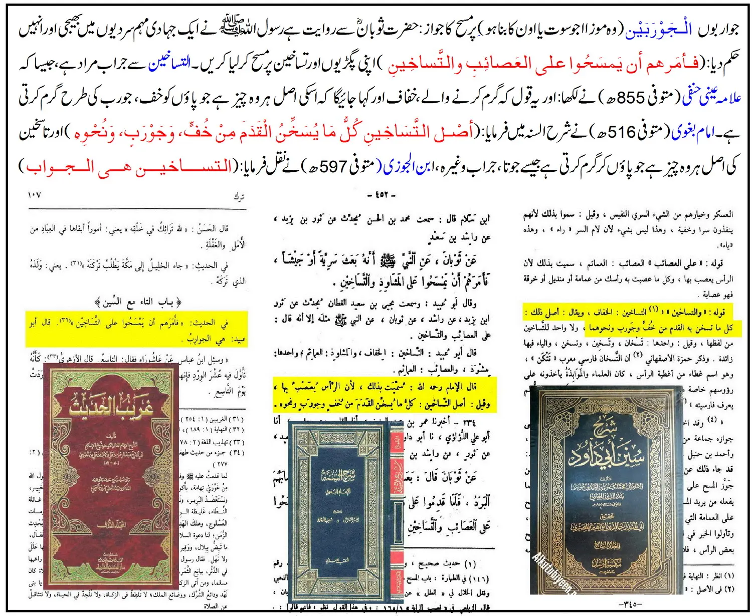 اس حدیث میں آیا کہ نبی ﷺ نے انہیں حکم دیا کہ تساخین پر مسح کریں۔ ابو عبید نے کہا: مراد اس سے جرابیں ہیں۔