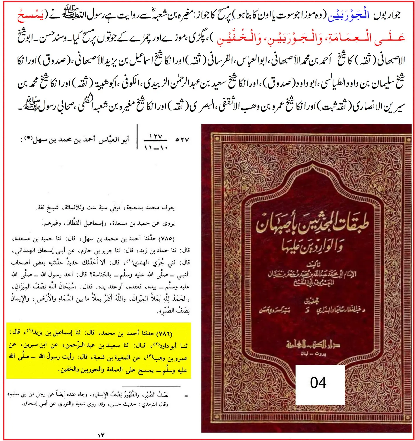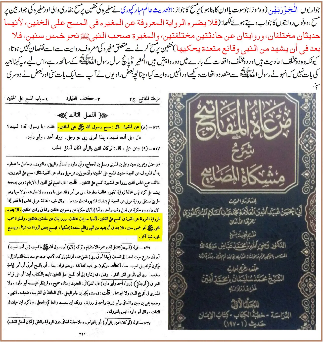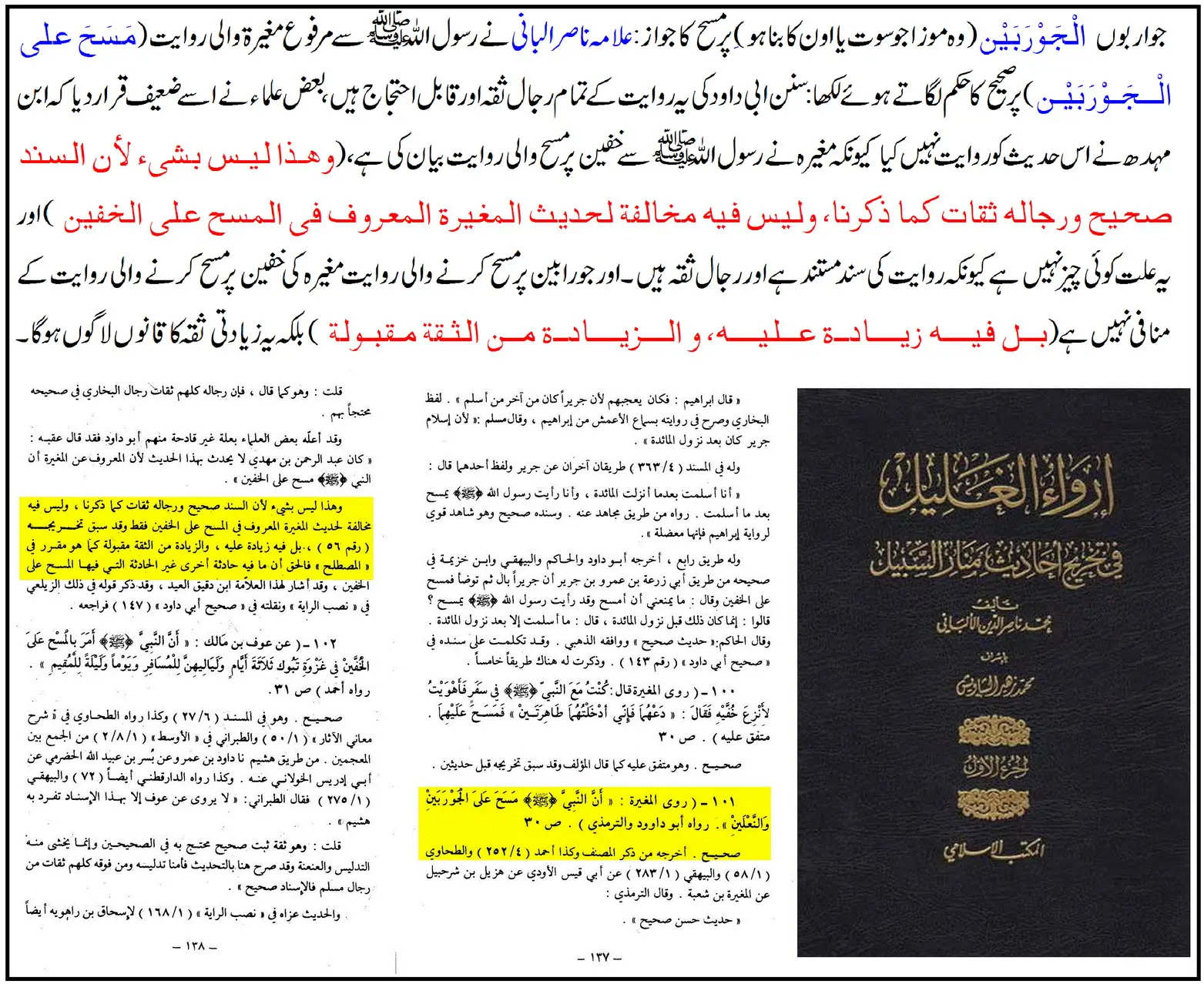"مغیرہؓ کی روایت کہ نبی ﷺ نے جرابوں اور جوتوں پر مسح کیا، صحیح ہے۔ اس کے تمام رواۃ ثقہ ہیں۔ اگرچہ بعض نے اس پر اعتراض کیا، لیکن یہ اعتراض مردود ہے، کیونکہ یہ روایت دیگر روایات کے خلاف نہیں بلکہ زیادۃ الثقة کے اصول کے تحت قبول کی جائے گی۔”