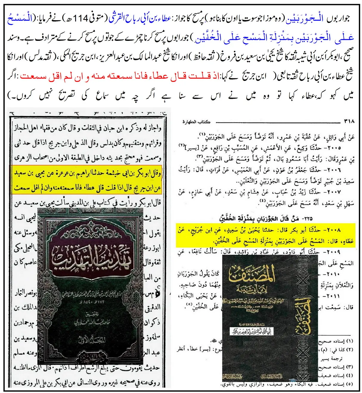 • ائمہ حدیث (امام احمد، اسحاق بن راہویہ، سفیان ثوری، ابن تیمیہ، ابن قدامہ وغیرہ) کے نزدیک جرابوں پر مسح جائز ہے۔