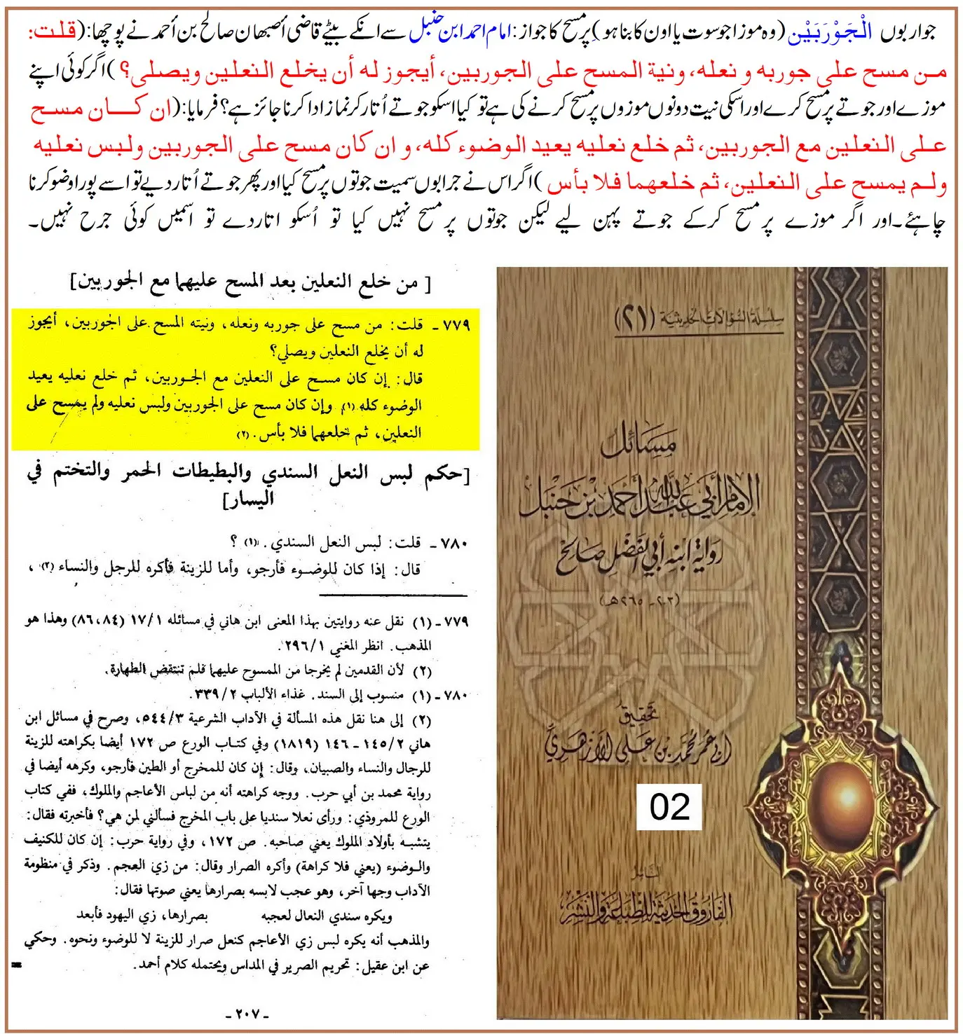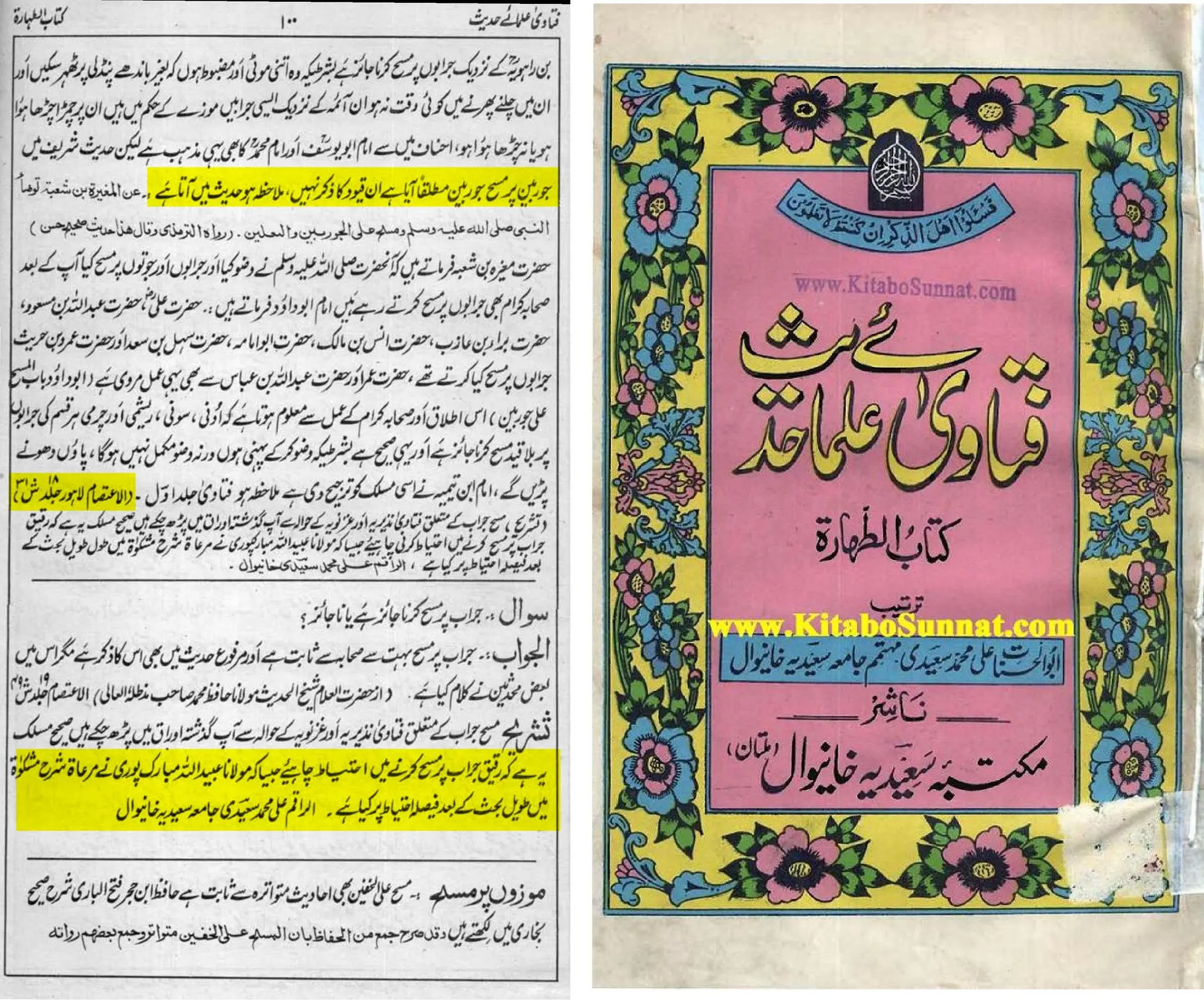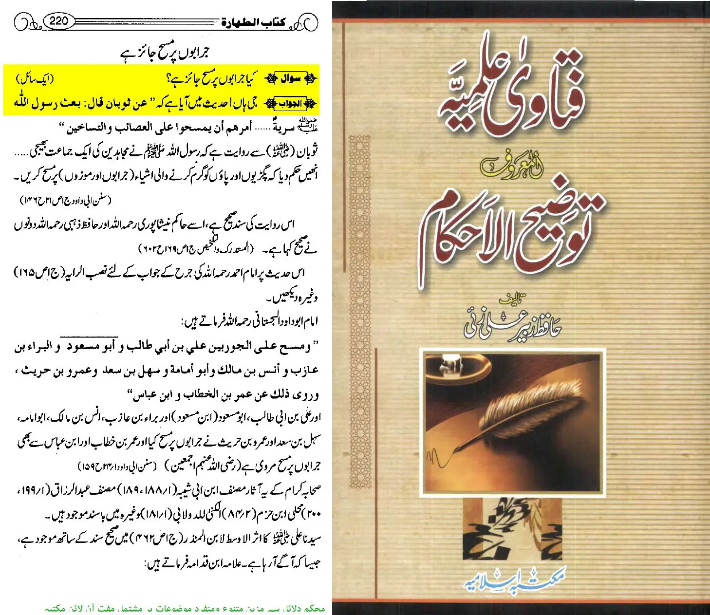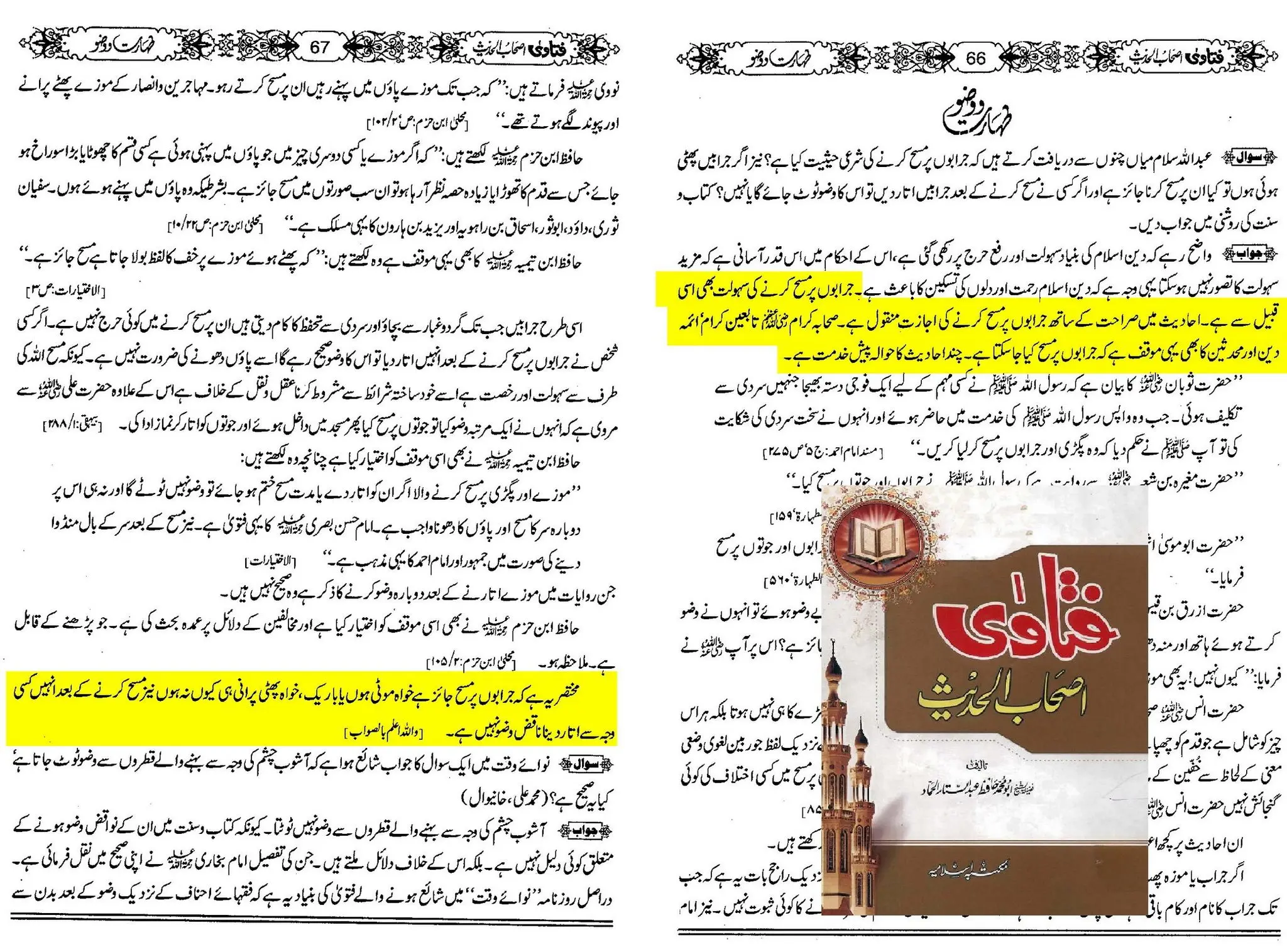 "مختصر یہ ہے کہ جرابوں پر مسح جائز ہے، خواہ موٹی ہوں یا باریک، نئی ہوں یا پرانی۔ اور مسح کرنے کے بعد اگر اتار دی جائیں تو وضو ناقص نہیں ہوتا۔”