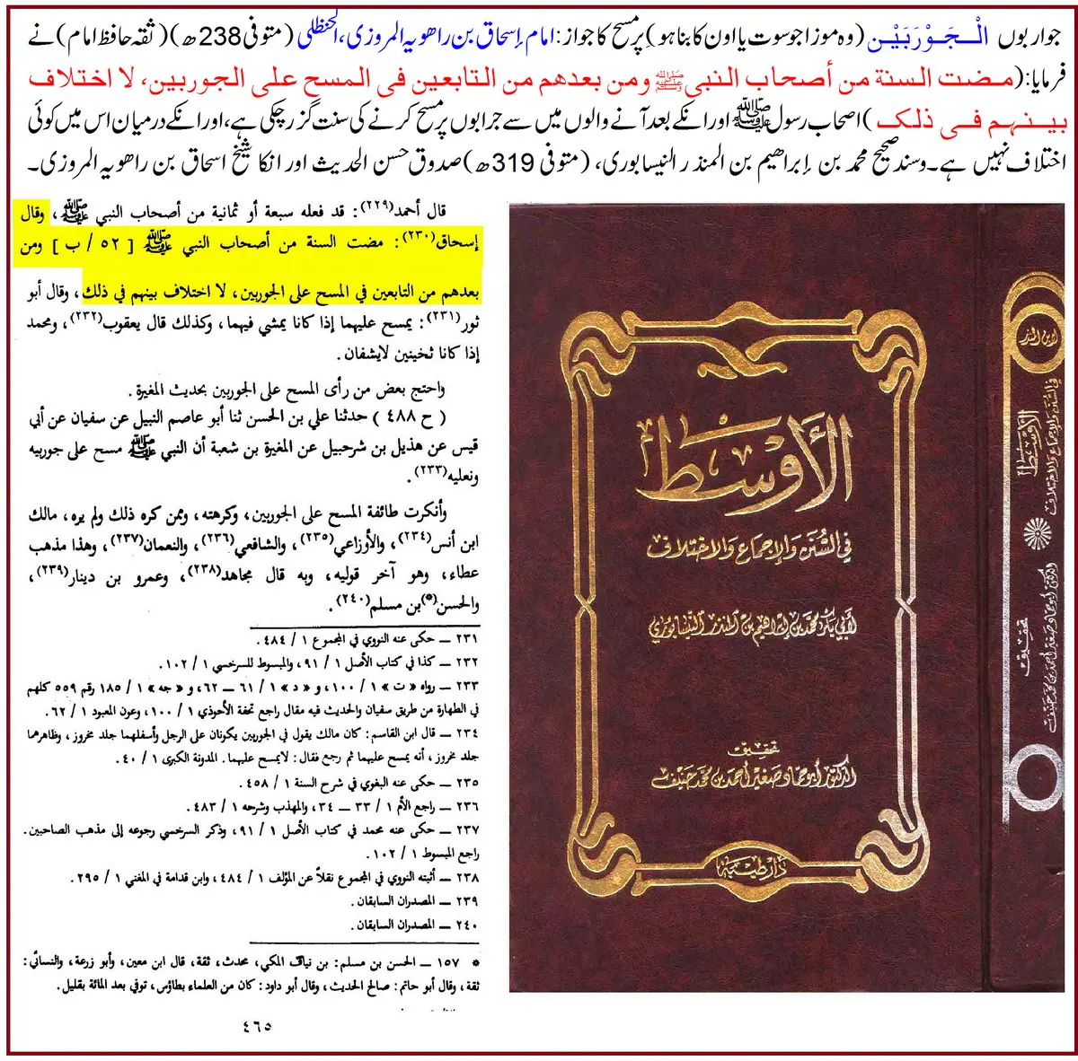 امام اسحاق بن راہویہؒ نے کہا: رسول اللہ ﷺ کے صحابہ اور ان کے بعد تابعین سے یہ سنت چلی آ رہی ہے کہ جرابوں پر مسح کیا جائے، اور اس بارے میں ان کے درمیان کوئی اختلاف نہیں۔
