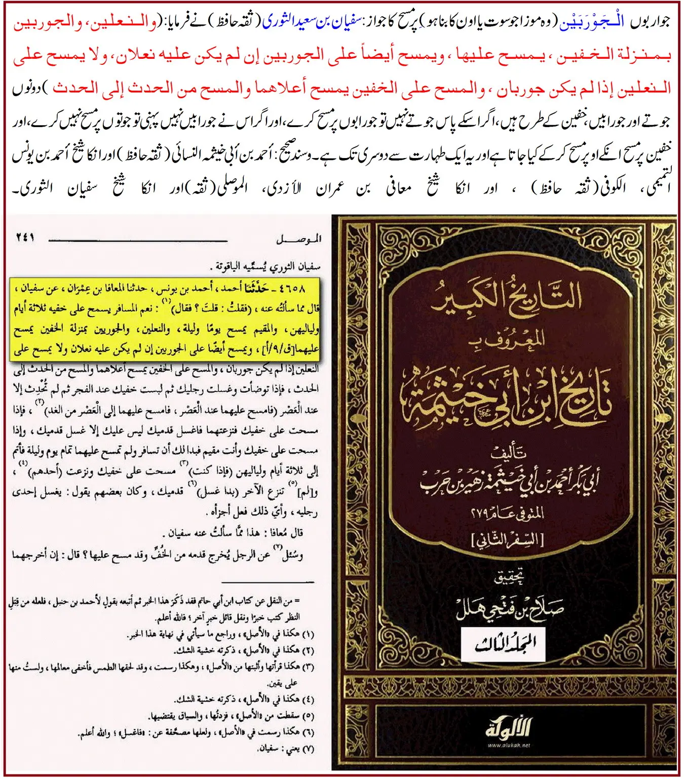 • امام سفیان ثوریؒ: "جرابیں اور جوتے خفین کی طرح ہیں، ان پر مسح کیا جا سکتا ہے۔” (تاریخ ابن أبي خيثمة)