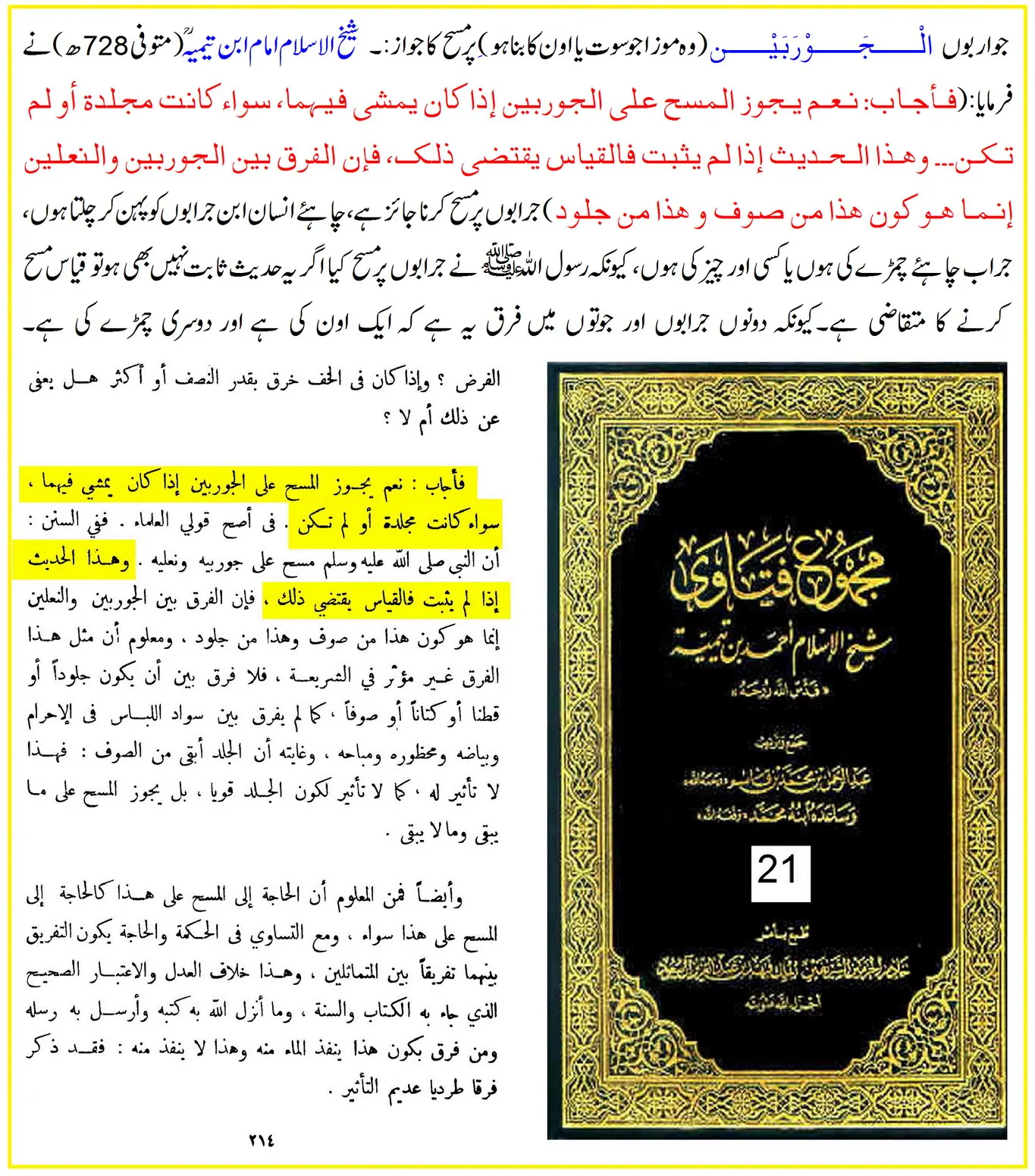انہوں نے جواب دیا: "جی ہاں، جراب پر مسح کرنا رسول اللہ ﷺ سے ثابت ہے، شیخ ابن تیمیہ نے فتاویٰ میں تفصیل لکھی ہے۔”