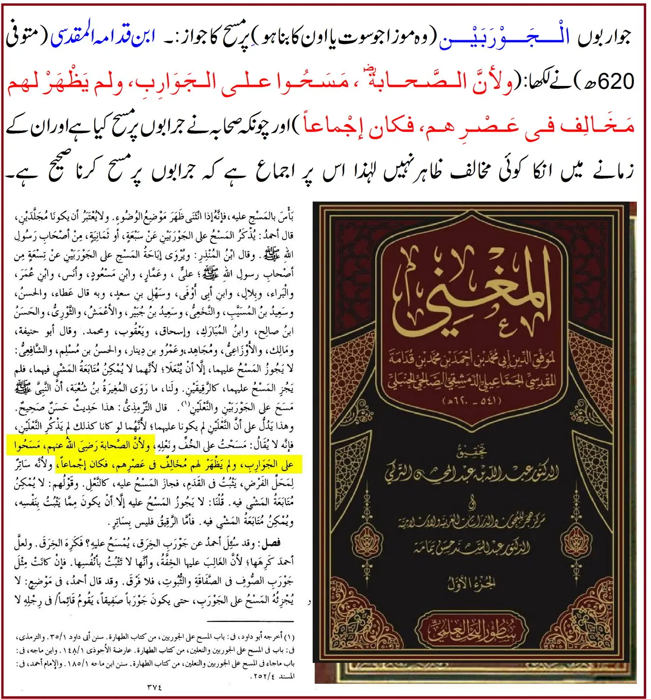 صحابہ کرامؓ نے جرابوں پر مسح کیا، اور ان کے دور میں کوئی مخالف ظاہر نہ ہوا، لہٰذا یہ اجماع ہے۔