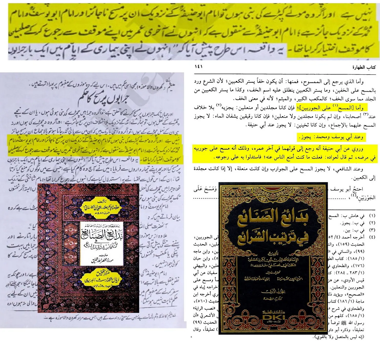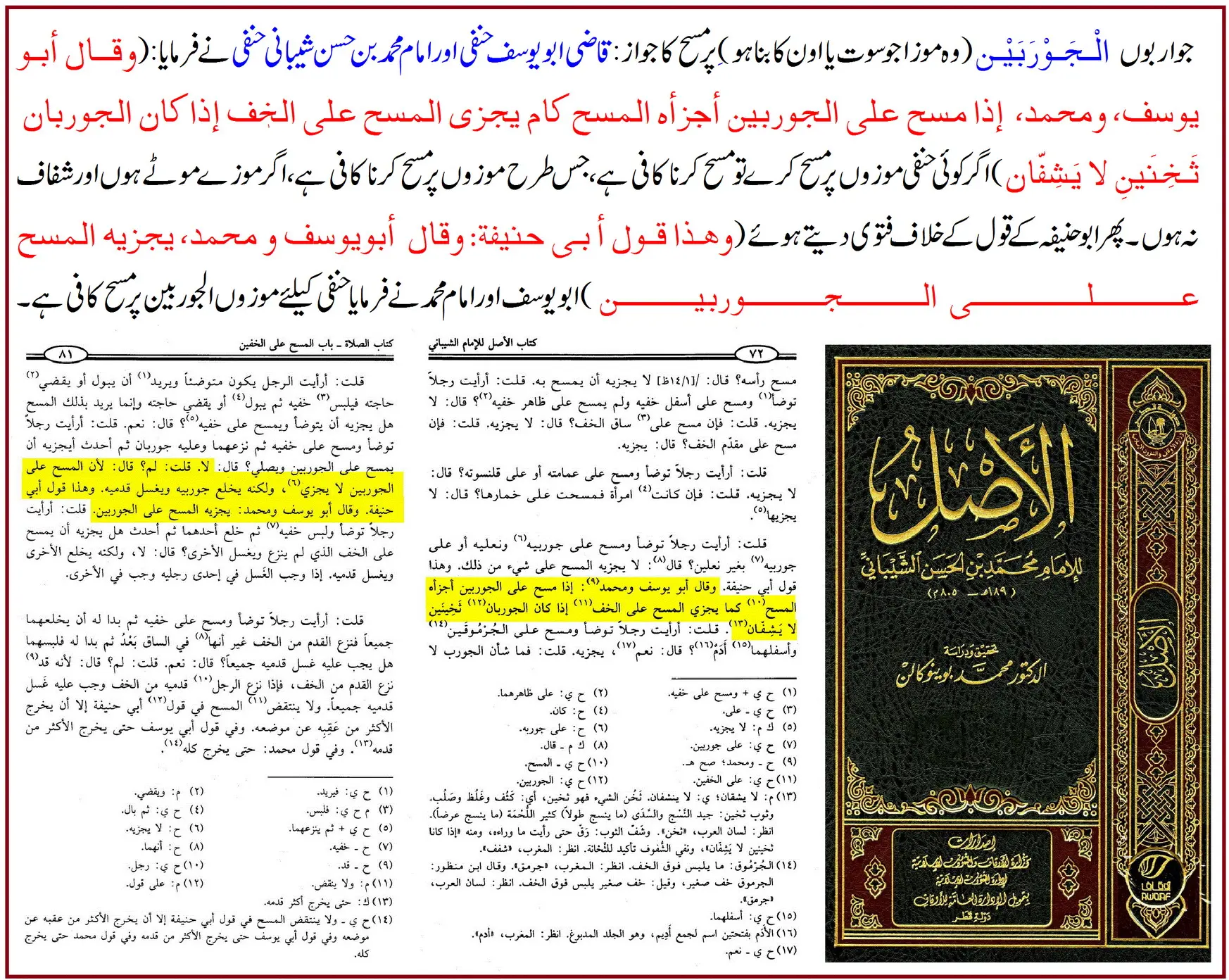 ابو یوسف اور محمدؒ نے کہا: اگر جرابیں موٹی ہوں اور پاؤں نظر نہ آتے ہوں تو ان پر مسح کرنا جائز ہے، بالکل اسی طرح جیسے خفین پر مسح کرنا جائز ہے۔