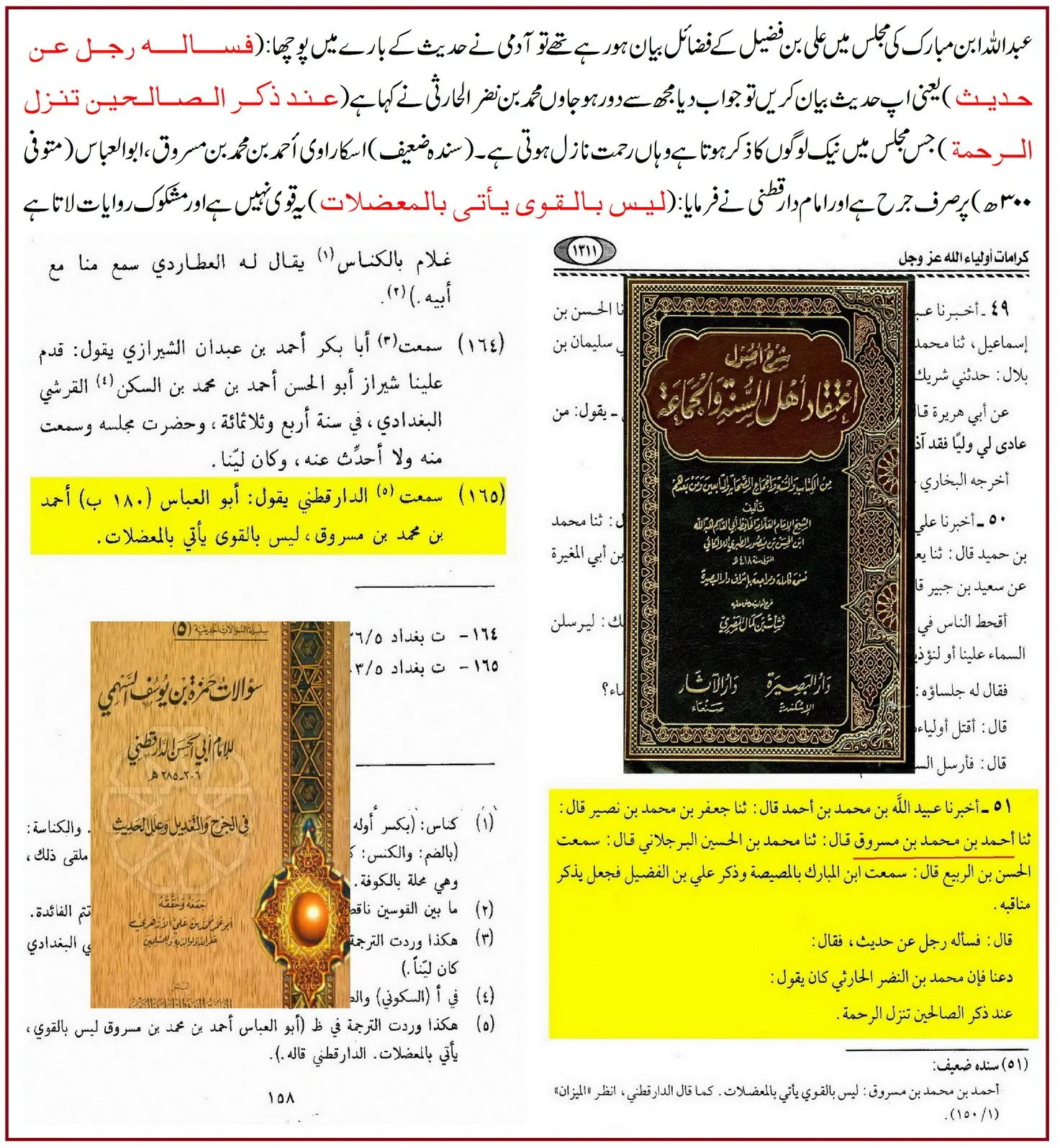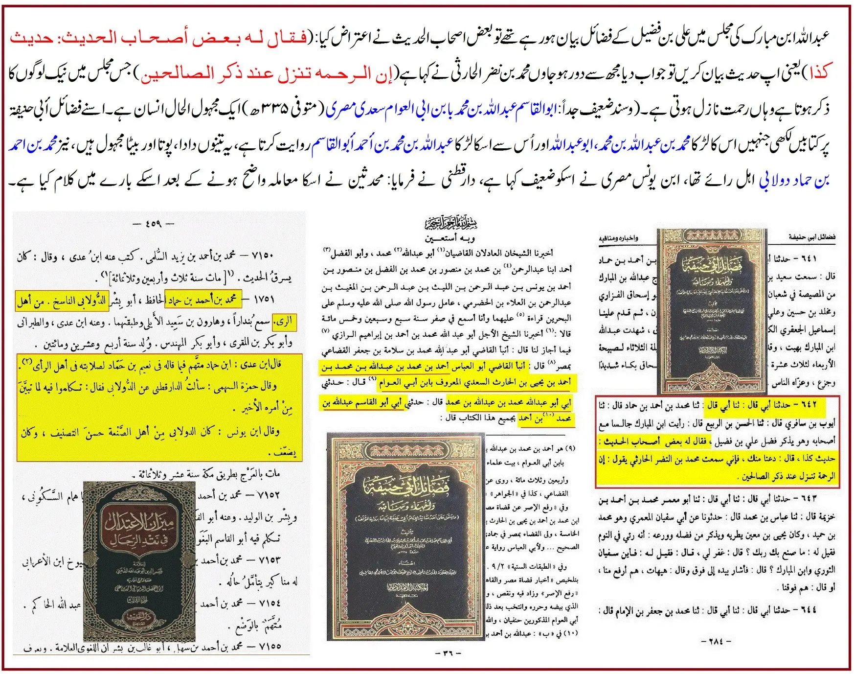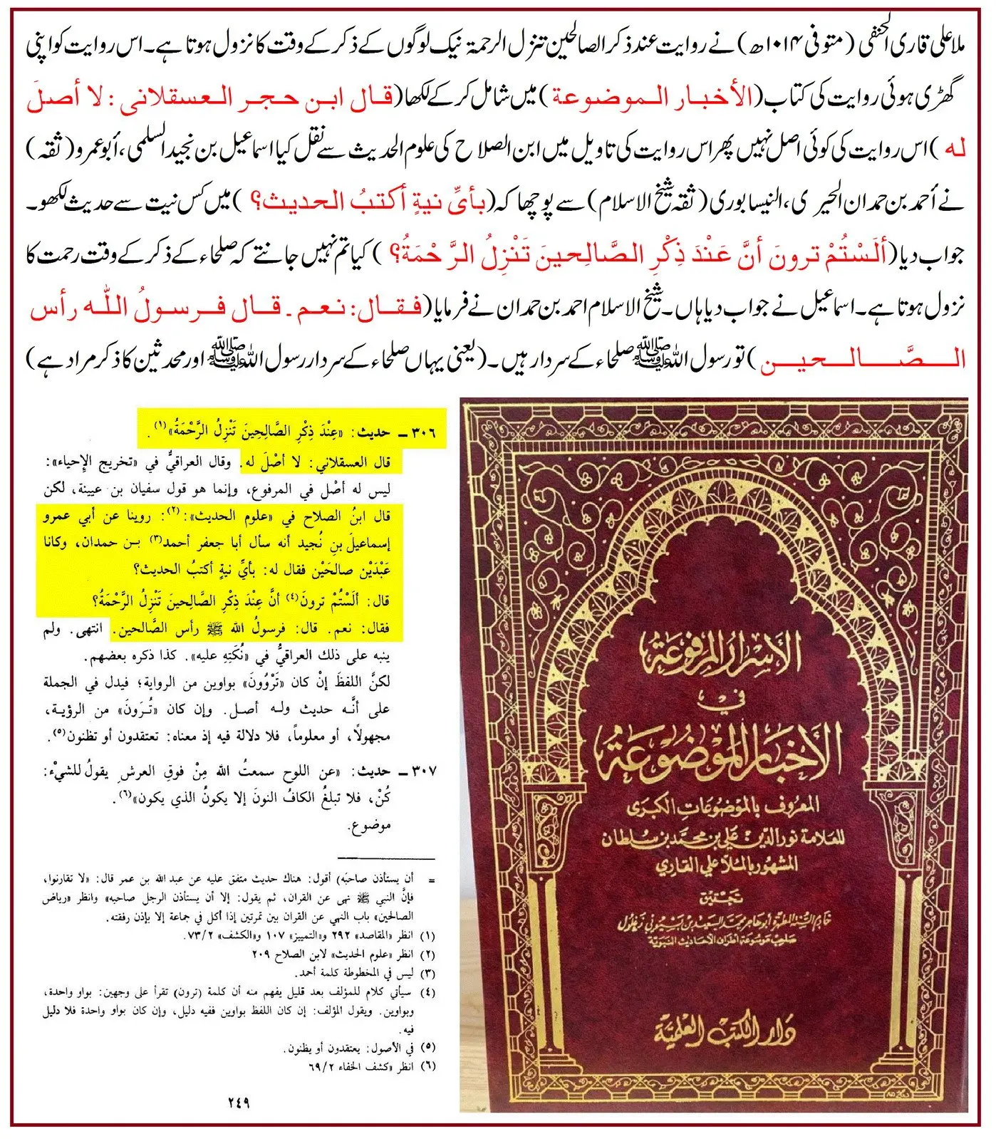 حنفی حضرات ایک روایت پیش کرتے ہیں کہ جہاں صالحین کا ذکر ہوتا ہے وہاں رحمت نازل ہوتی ہے۔ اس روایت کو بنیاد بنا کر وہ یہ مؤقف اختیار کرتے ہیں کہ احادیث بیان کرنے کی بجائے اولیاء و صلحاء کے فضائل و مناقب بیان کرنا افضل ہے، کیونکہ ان کے ذکر کے وقت رحمت اترتی ہے۔ لیکن جب ہم اس روایت کے مصادر اور اس کی سند کا باریک بینی سے جائزہ لیتے ہیں تو یہ بات کھل کر سامنے آتی ہے کہ یہ روایت سنداً ثابت نہیں ہے اور ائمہ محدثین نے اسے موضوع یا کم از کم غیر معتبر قرار دیا ہے۔